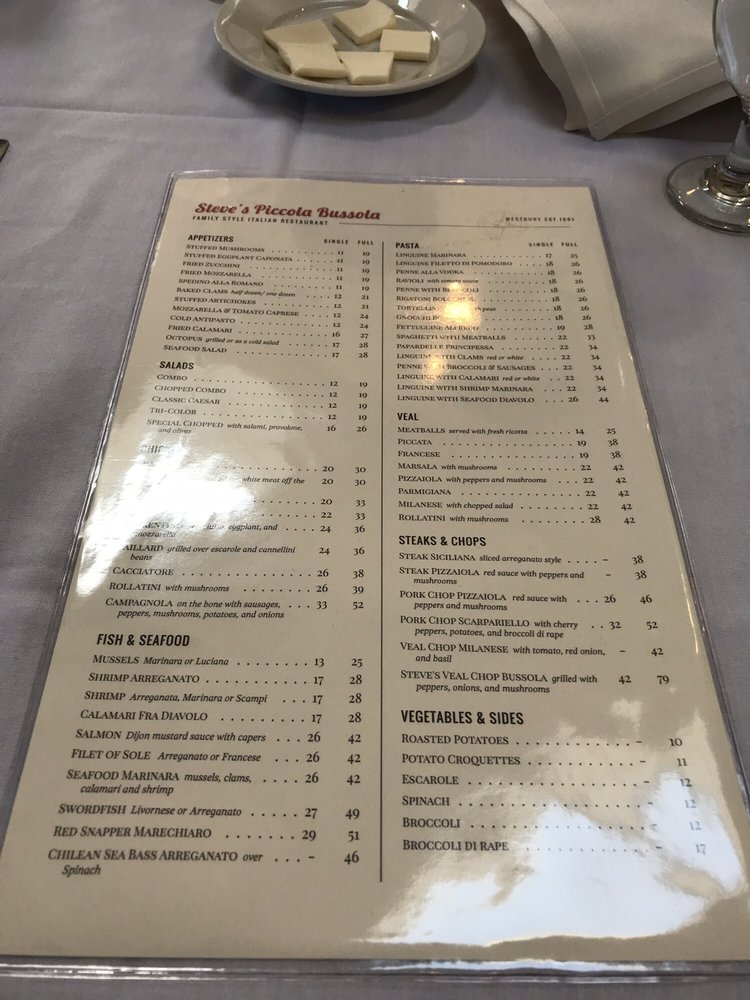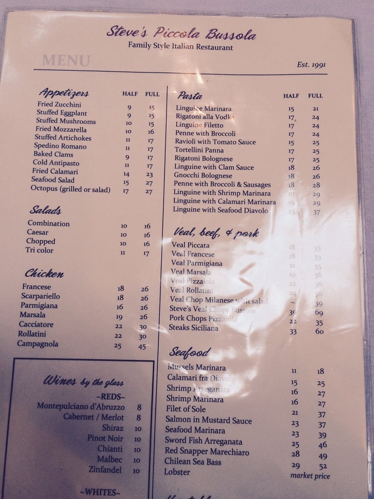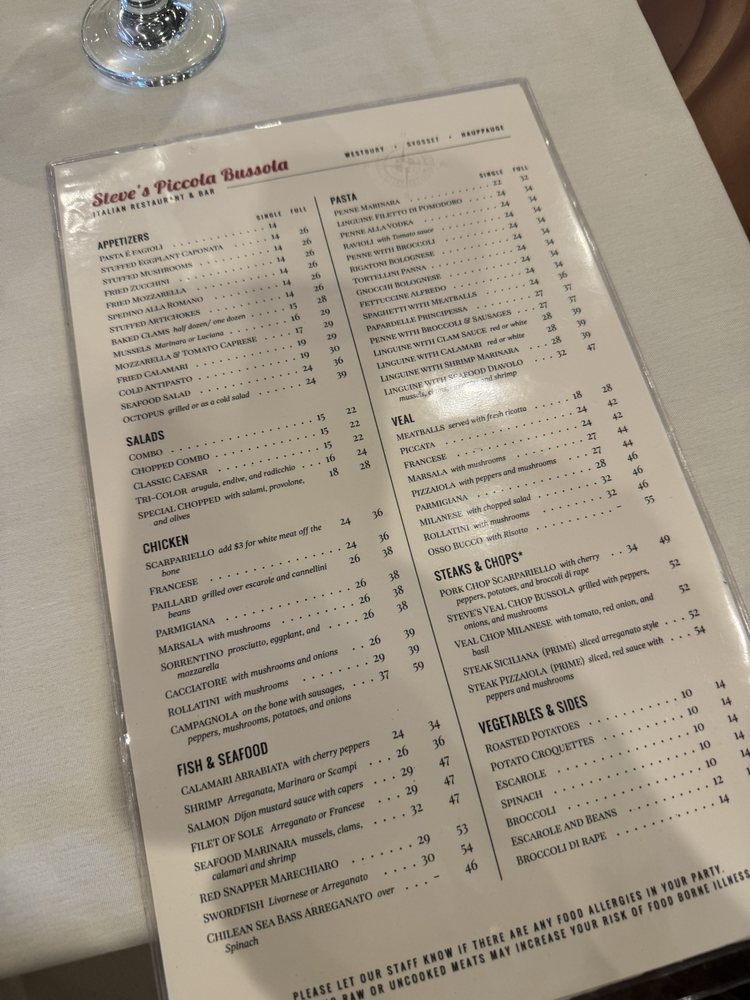 Steve’s Piccola Bussola is an Italian restaurant located in Westbury, NY, offering a wide range of appetizers, salads, and chicken dishes. With options for delivery, takeout, and reservations, this restaurant caters to various customer needs. The menu includes dishes like Stuffed Eggplant Caponata, Fried Calamari, and Chicken Parmigiana. Customers rave about the generous family-style portions and fresh ingredients. The attentive staff and cozy ambiance contribute to a pleasant dining experience. Reviews highlight dishes like Chicken Scarpariello, Linguine Seafood Diavlo, and Veal Bolognese over ziti, all cooked to perfection and bursting with flavor. Whether you're craving traditional Italian fare or looking to try something new, Steve’s Piccola Bussola promises a satisfying meal with impeccable service.